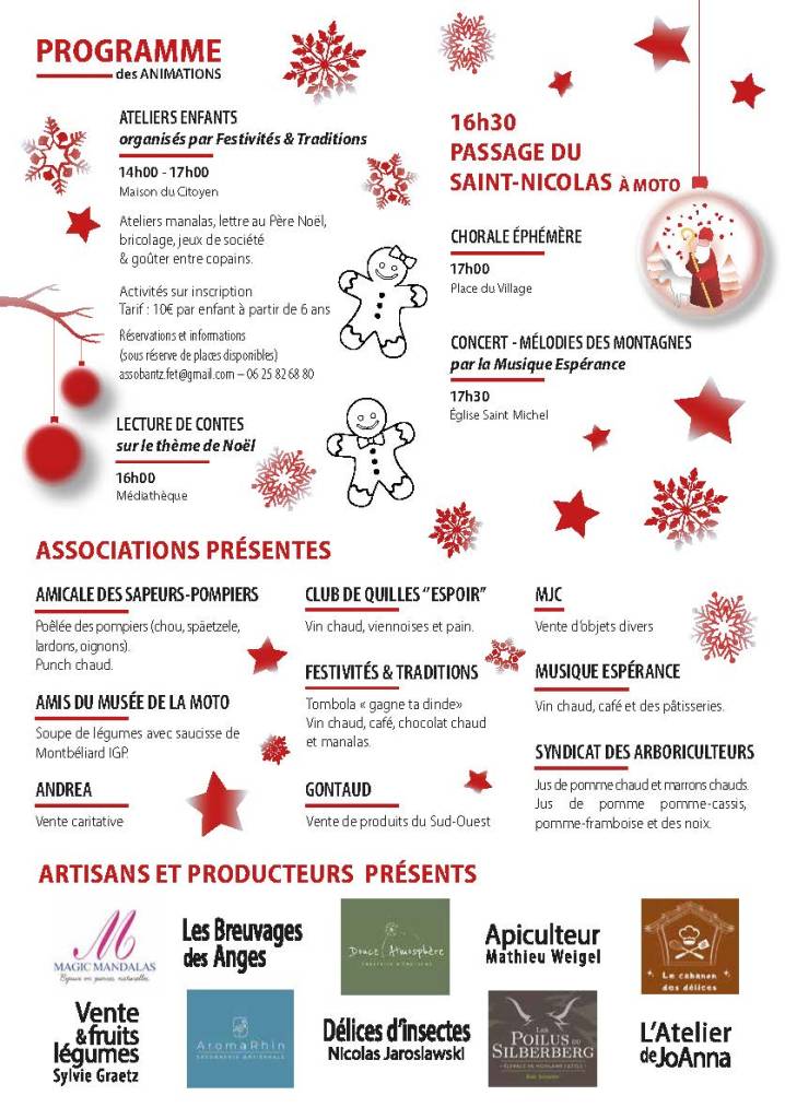 Repas : Tarte flambée boissons et vin chaud 🍷tout au long de la journée préparé et servi par les Jeunes Agriculteurs Sundgau dans le bâtiment chauffé de la salle de traite. Crêpes 🥞 , jus de pomme 🧃 chaud et chocolat chaud préparé et servi par l’association de l’Ecole Bisel-Feldbach-Riespach .