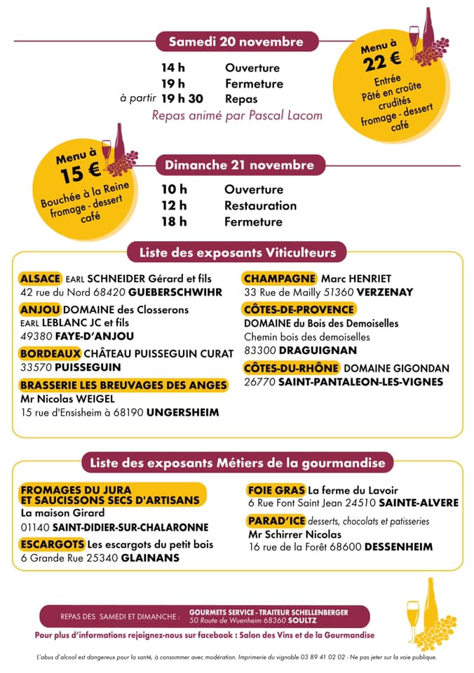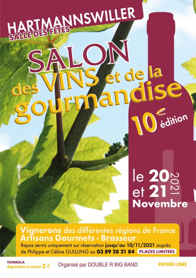 Samedi 20 novembre de 14h à 19h, et dimanche 21 novembre de 10h à 18h, 10ème édition du Salon des Vins et de la Gourmandise, Salle des fêtes de HARTMANNSWILLER.