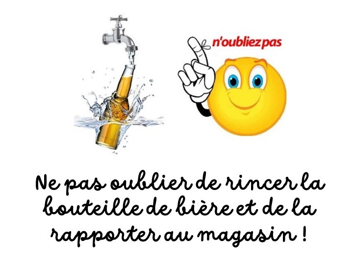 Rincez soigneusement la bouteille à l’eau claire, et rapportez-la à votre brasseur préféré, qui va la réutiliser !